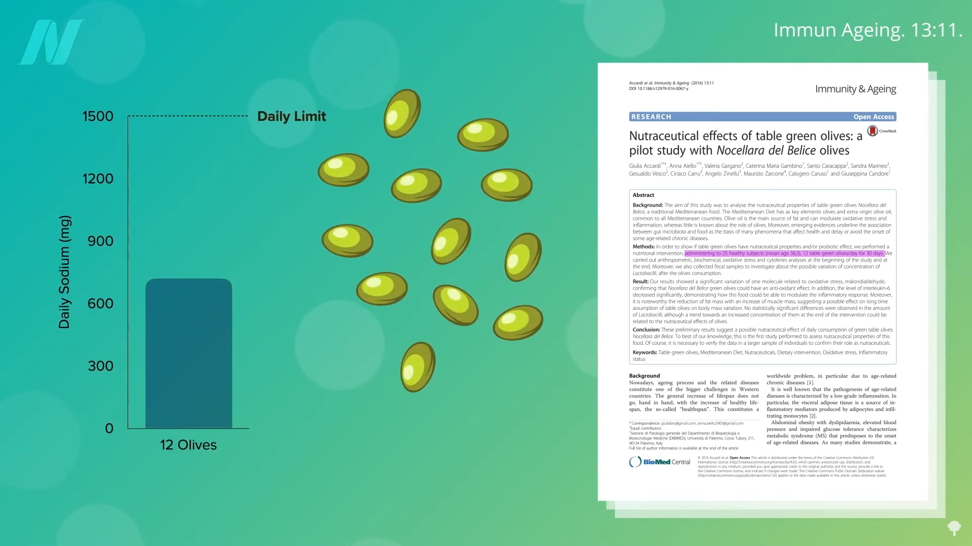 So, should we just stick to olives? Sadly, a dozen olives could take up nearly half your sodium limit for the entire day, as you can see below and at 3:47 in my video.